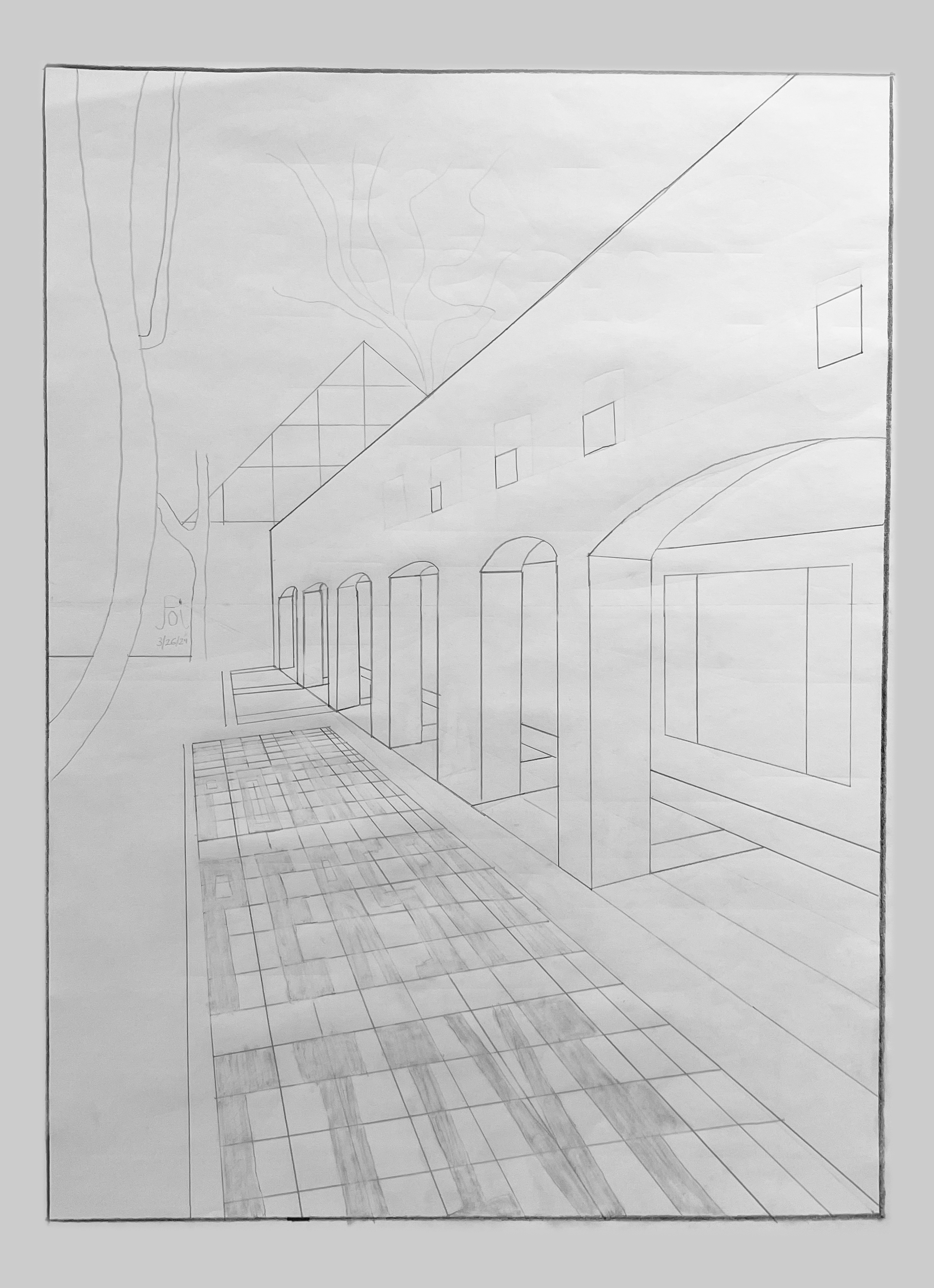 This drawing was done in the courtyard of the Arapahoe Community College Art and Design Center. It is a urban landscape drawing.